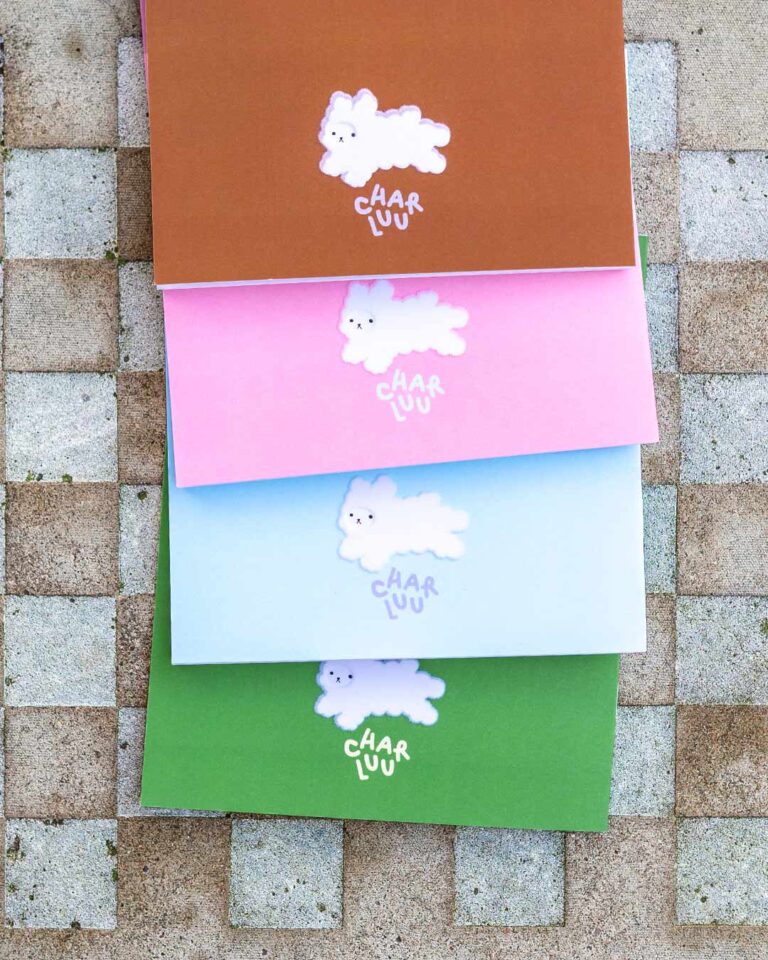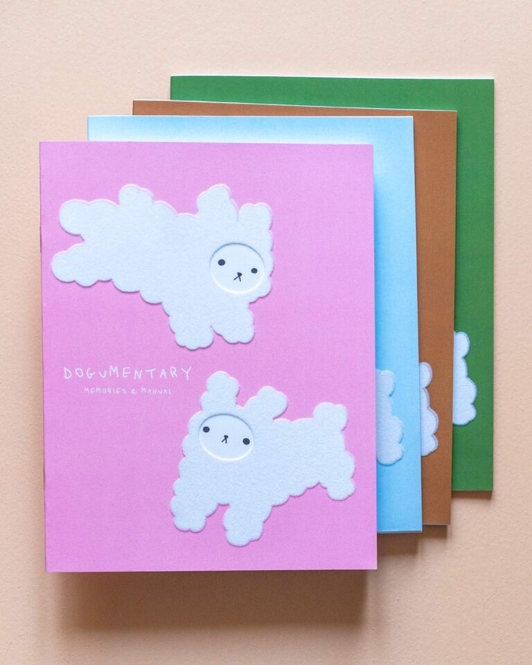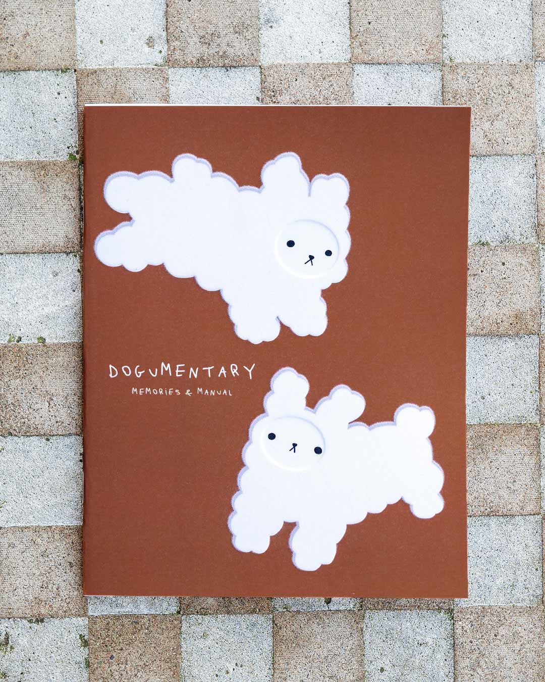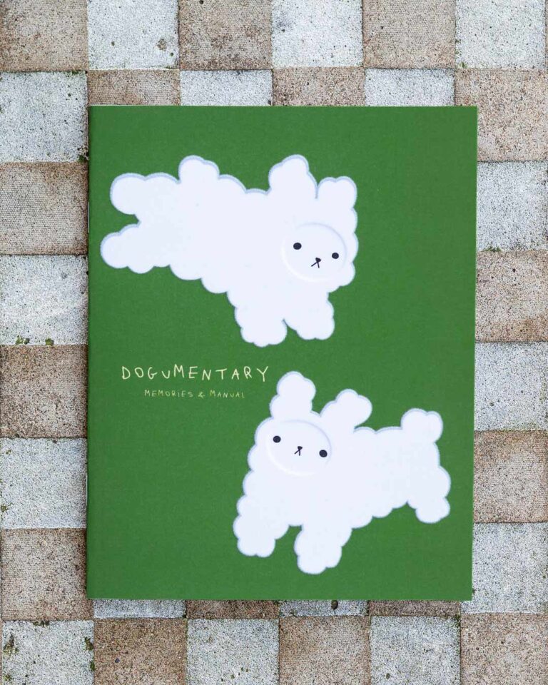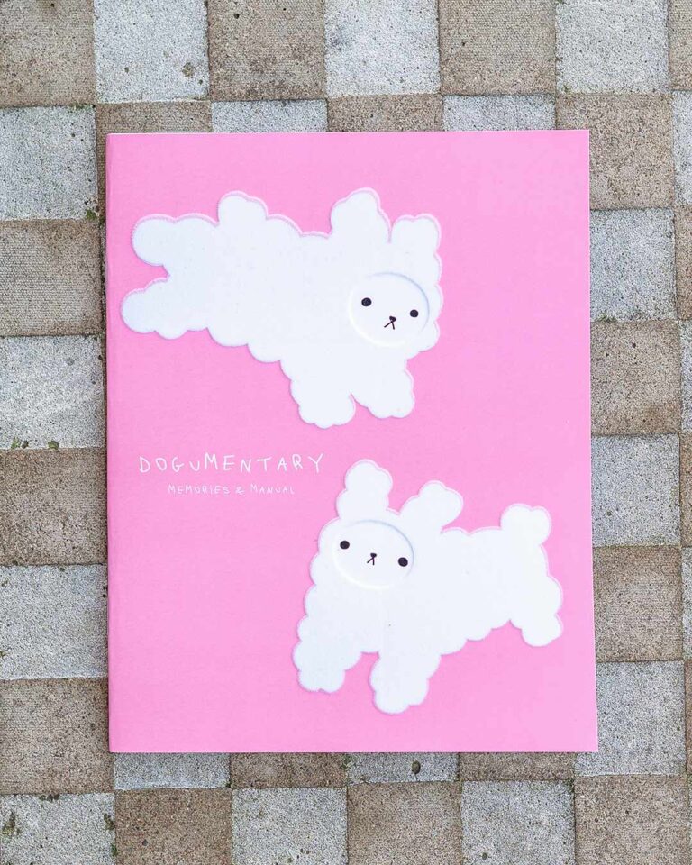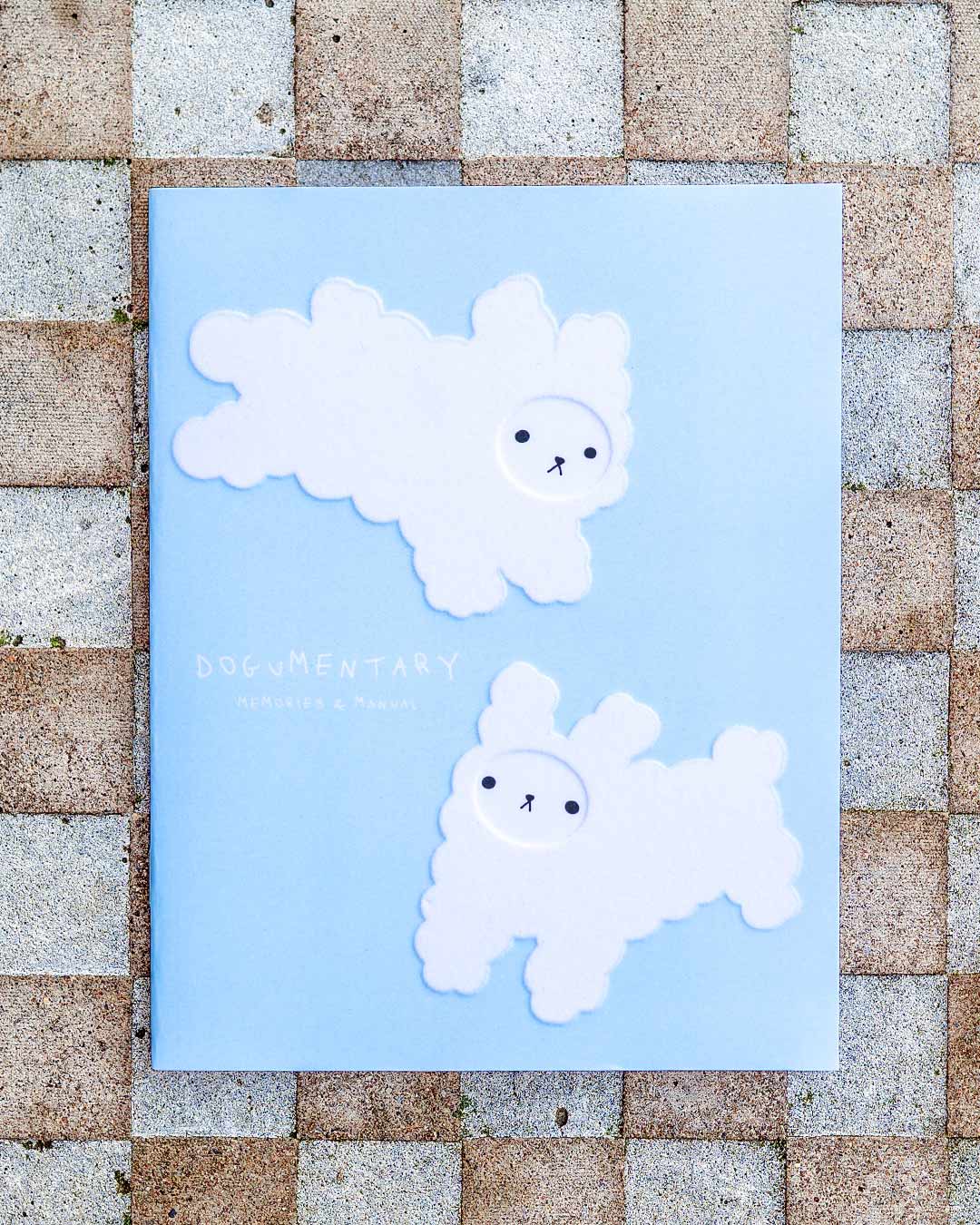 DOGUMENTARY has a cover with small white dogs that have a flocked, lightly plush surface.The cover is finished with soft touch lamination,which makes it durable and pleasant to hold. The dogs have a subtle 3D plush texture that you will want to pet every time you pick the notebook up. Their faces are die cut,giving them a little ninja look. In person it is even cuter than it sounds. 🤍