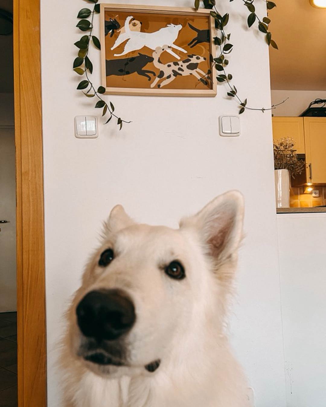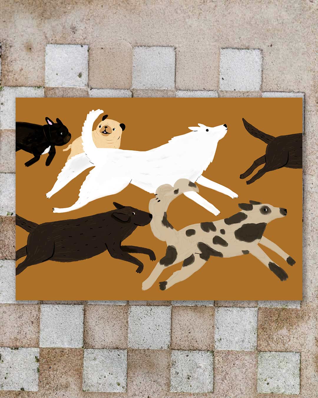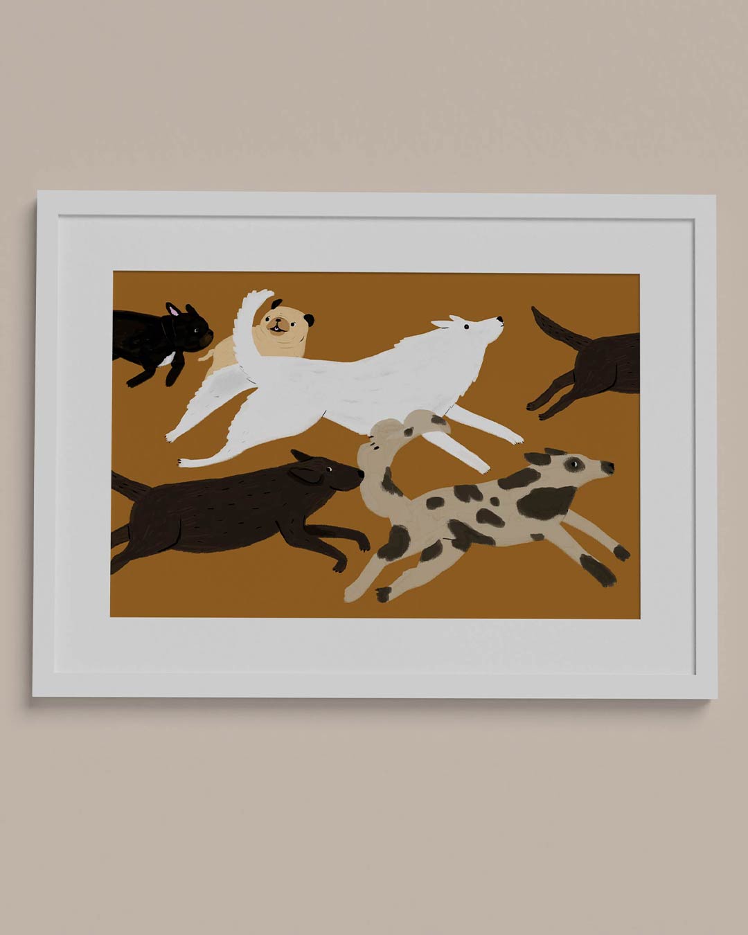 Plakát A3 s autorskou ilustrací běžících pejsků se side-eye pohledem na hnědém pozadí.