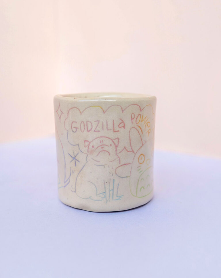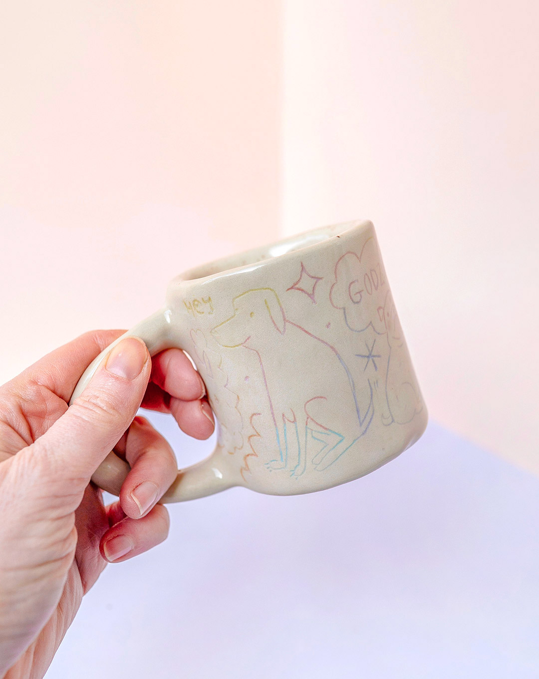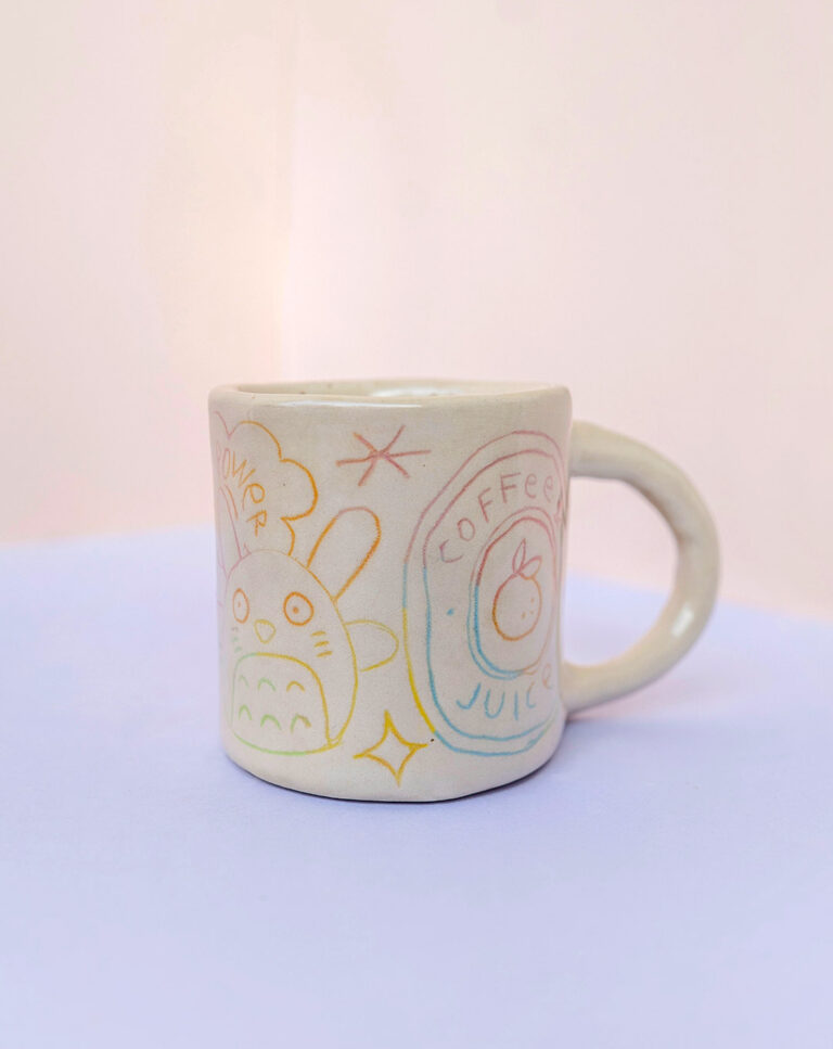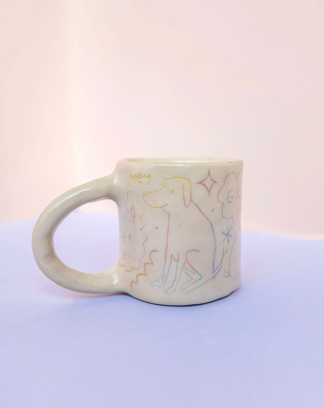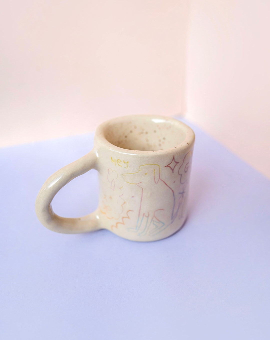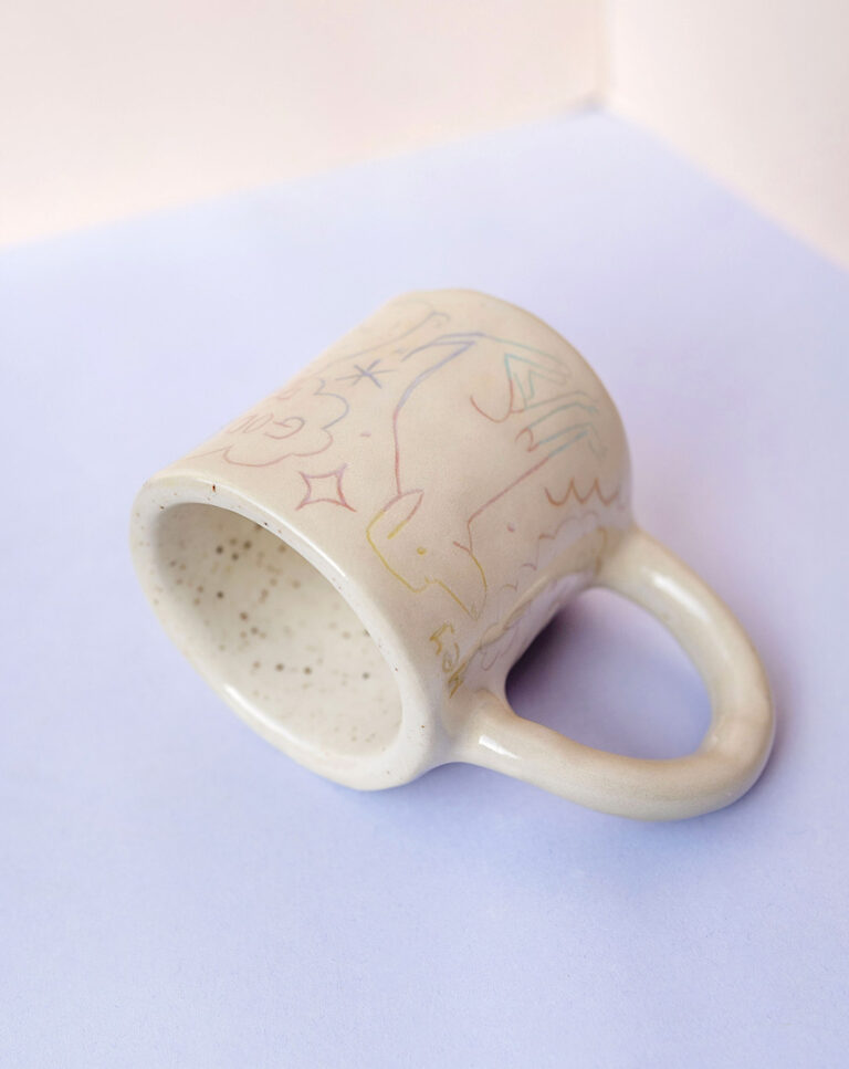Ručně vyrobený a malovaný malý hrnek s ouškem s názvem „Rainbow Minimal“, ideální na malé, silné kafíčko. Je béžový, s vyrytou kresbou vyplněnou duhovými barvami. Hrnek zdobí roztomilé motivy a je pokryt lesklou glazurou. Uvnitř je tečkovaný.