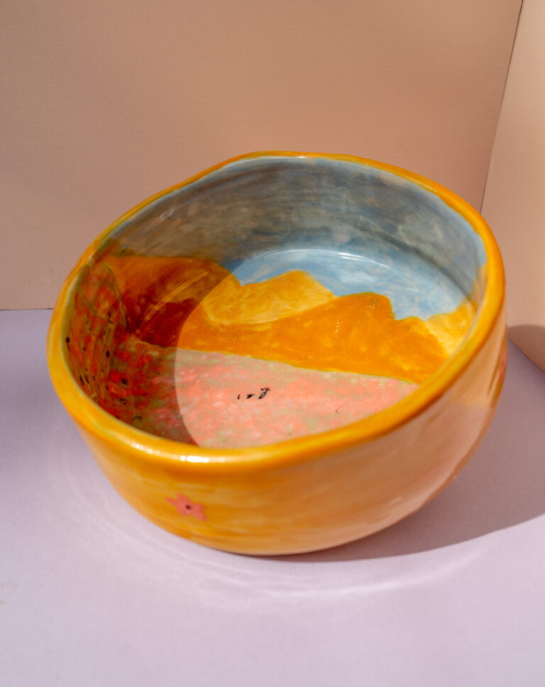 Ručně malovaná a vyrobená kameninová miska s ilustrací s motivem krajiny. Hory a před nimi rozkvetlá louka se siluetou postavy s culíkem a pejskem<3. Zvenku je miska zrzavá s růžovými kvítky. Růžové květy na vnější straně mají strukturu malých bublinek, je to jen reakce konkrétních 2 barev dohromady (na používání to nemá žádný vliv, je to jen struktura). Celá miska je naglazovaná lesklou glazurou. Průměr cca 18 cm, výška 6,3 cm.